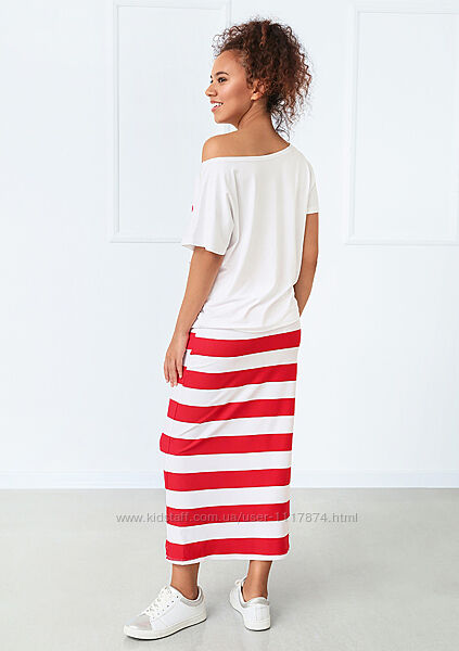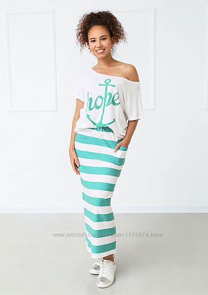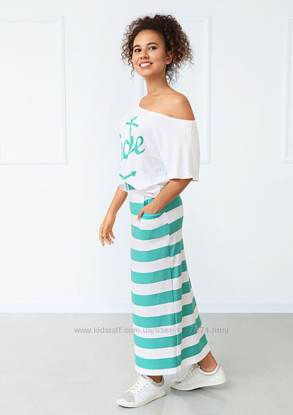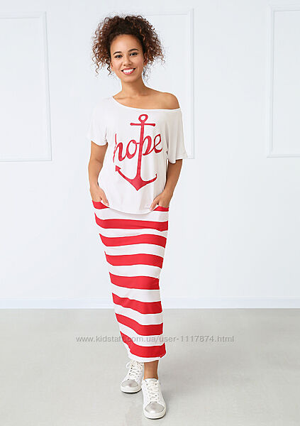 Літній костюм складається з футболки "oversize" і довгої спідниці з кишенями. Завдяки вільному крою і широкому вирізу горловини, футболку можна носити із напуском на одне плече. Спідниця максі має зручну високу посадку, широкий пояс на резинці і шнурку. З боків є дві функціональні кишені. Особливого морського шарму надають аплікація великого якоря на однотонній футболці і принт спідниці в широку смужку.