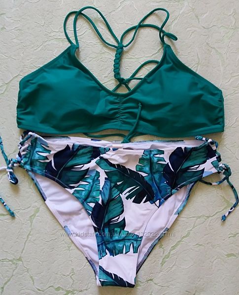 Супер красивый купальник бикини отличного качества материала и пошива. Бюстгальтер мягкий со сьемными поролоновыми чашечками, сзади завязывается (можно регулировать обьем). Трусики полностью на подкладке, по бокам шнуровка, можно регулировать обьем. Талия средняя. Размеры: S: обхват груди 86-90 см под грудью можно регулировать чашечка А/В обхват бедер 88-96 смXL: обхват груди 98-105 см под грудью можно регулировать чашечка А/В/C, обхват бедер 106-110 см