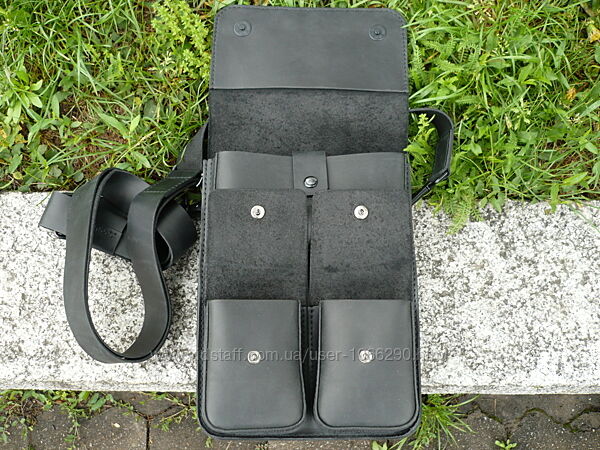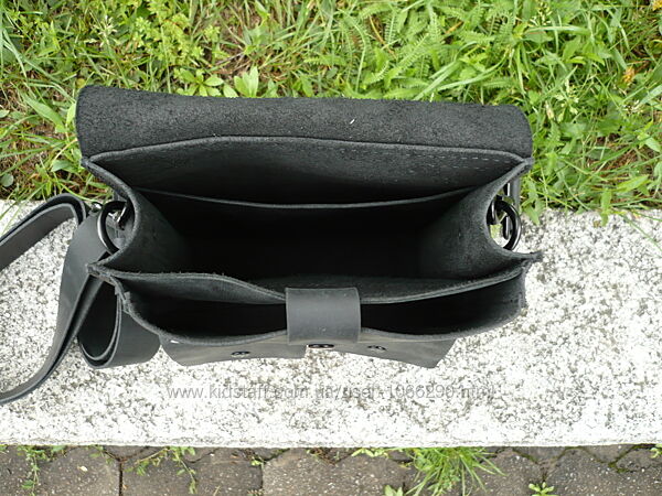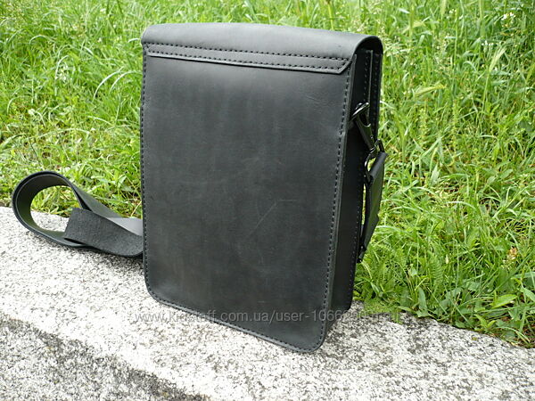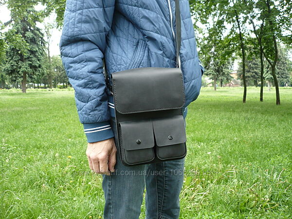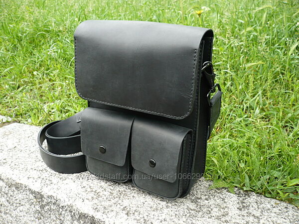 Сумка из кожи КРС "crazy horse" производства Италии, цвет черный. Размер основного отделения 200*260*70 мм, внешние карманы - 95*115*30 мм, карман для телефона - 190*100*15 мм. В основном отделении есть внутренний карман. Прошита вощеной нитью galaces 0,55 mm. Ремень из кожи, ширина 40 мм. Урезы обработаны средством tokonole (Япония) . Финишное покрытие - крем IEXI wrens dubbin. Ручная работа. Ценность: 2600 грн.