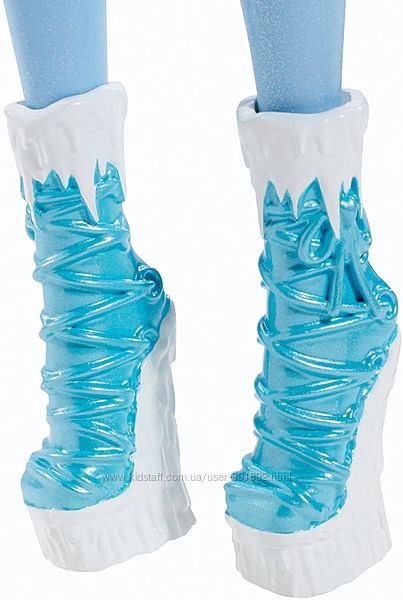 У Эбби голубая блестящая кожа, белые волосы с розовыми и голубыми прядями, коготки вместо ногтей и она совсем чуть-чуть выше своих подруг. В этой коллекции у Эбби яркий макияж: ярко-голубые тени и алые губы. Ее одежда - черное с голубыми и розовыми полосками, которые, кстати, похожи на потрескавшийся лед, платье с коротким рукавом. Края воротничка и низа платья стилизованы под голубой мех. Также на платье присутствует голубой прозрачный пояс, состоящий как будто из сосулек. На ножках у Эбби голубые ботиночки, по верхнему краю отделанные чем-то, напоминающим белый мех или льдинки, и подошва у них тоже белая, даже, я бы сказала, жемчужная. Из аксессуаров на Эбби только сережки и розовые очки, чтобы отлетающие льдинки во время изготовления ею её ледяной скульптуры не попадали в глаза. Скульптура Эбби представляет собой что-то вроде ледяного сердца с огнем.