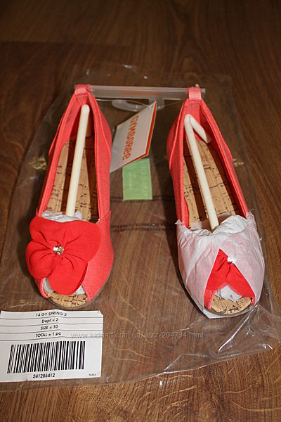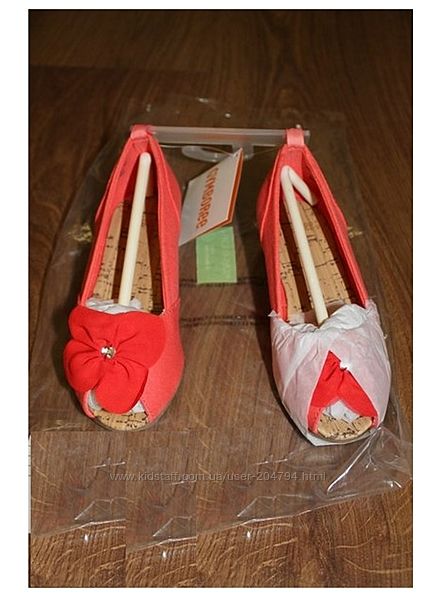 Туфли для девочек "Цветочек" от американского бренда "Gymboree " Есть не высокая танкетка/ платформа, при ходьбе танкетка не ощущается. Красивый декор "цветочек" из ткани. Цветок декорирован одним стразом. Верх туфлей текстиль, внутри тоже текстиль. Носок открыт.Цвет: коралловый