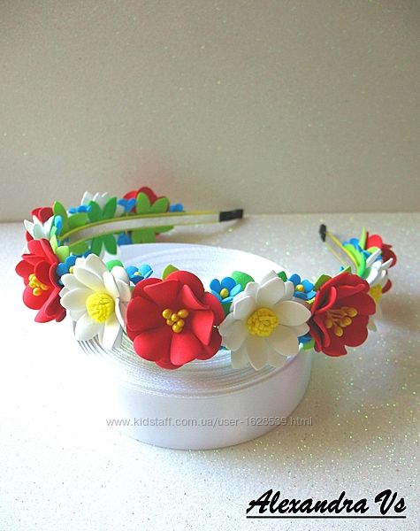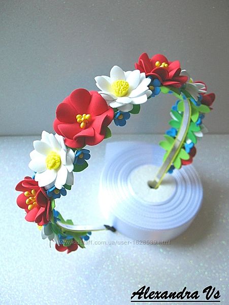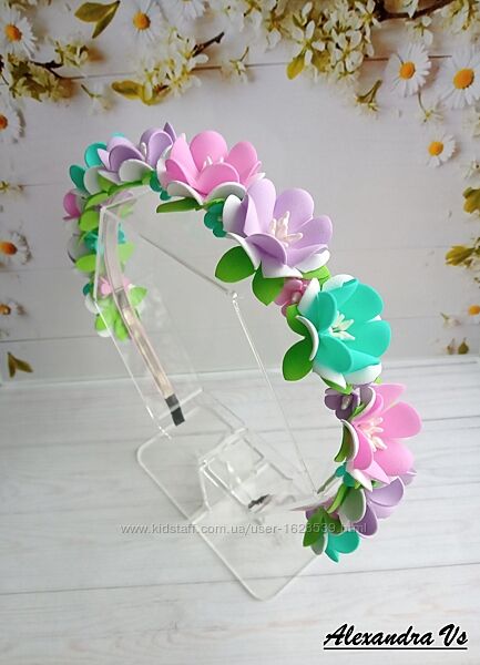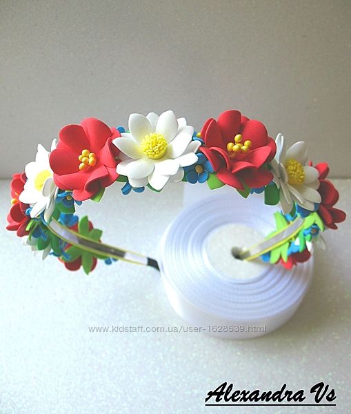 Очень красивый и нежный веночек с полевыми цветами из фоамирана. Все цветочки ручной работы. Размер универсальный. Основа - металлический обруч с атласной лентой. Возможно изготовление в любом другом цветовом варианте. Под заказ. Цена 140 грн.