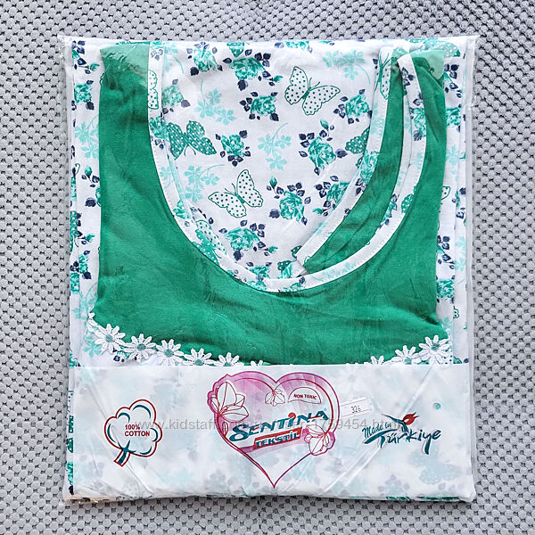 Нічна сорочка Sentina 60-64р. батал, виробник Туреччина. Спереду і ззаду кокетка з круглим вирізом. Широкі бретельки. 2 кольори : темно-бірюзовий, зелена. Матеріал 100% бавовна.
