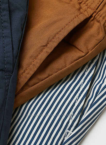 Шорти із комплекту 3 шт. з тонкої бавовняної тканини. Попереду бічні кишені та застібка обманка, усередині пояса широка гумка та шнурок, що діє. Продаються поштучно, бірка на одних. З нової колекції дитячого одягу провідного європейського бренду H&M.Розмір у наявності: 6-7 років, зріст 122 см, кольори в наявності: коричневий, синій