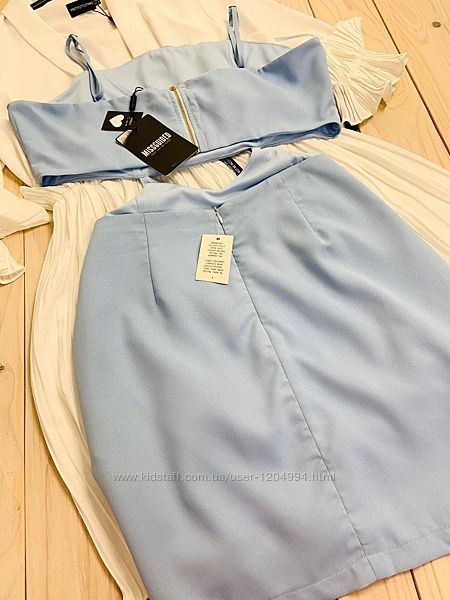 Невероятно красивое вечернее небесно-голубое платье с эффектом юбки и топа