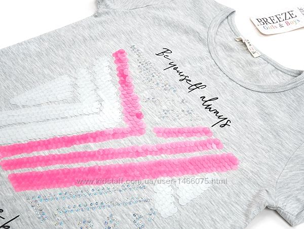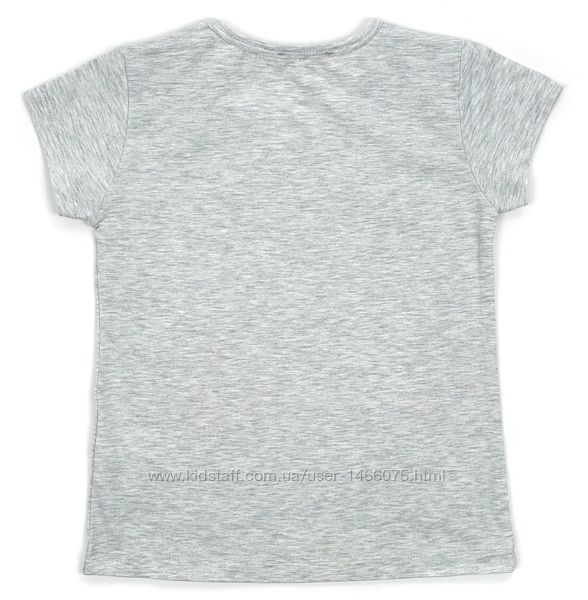 Летняя меланжевая футболка светло - серого цвета с принтовыми словами и рисунком из красивых пайеток для Вашей юной модницы! Футболка шикарно смотрится!