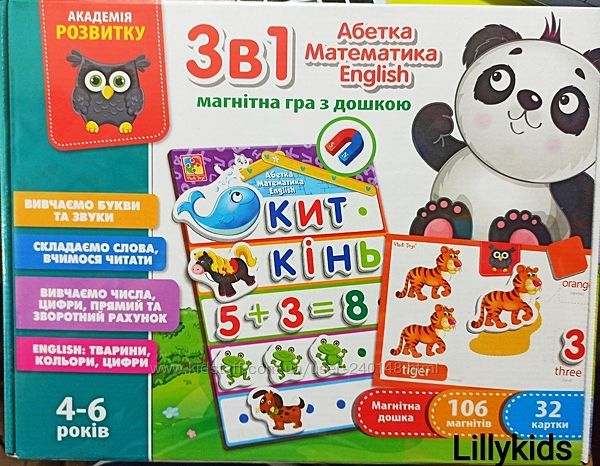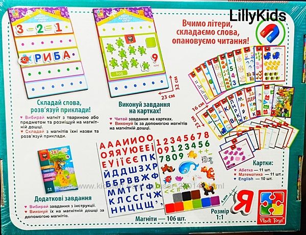 Комплектація: магнітна дошка, 106 магнітів, 32 картки із завданнями.