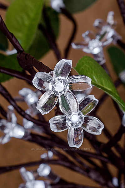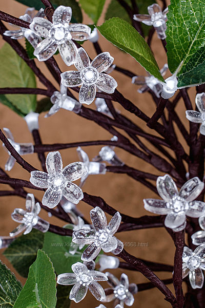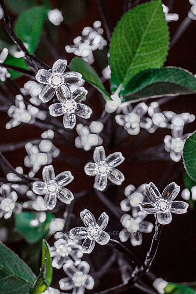 Светодиодное дерево Сакура.Декоративное дерево с подсветкой. Очень красиво светиться ночью и придает уюта в вашем доме. Ветки легко сгибаются, благодаря чему вы можете придавать форму кроны дерева, на свое усмотрение.Цвет веток коричневый, листья искусственные, очень похожие на натуральные, цветки изготовлены из прозрачного пластика