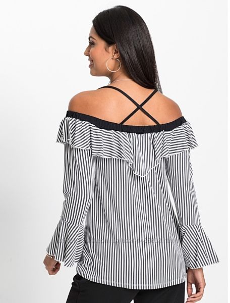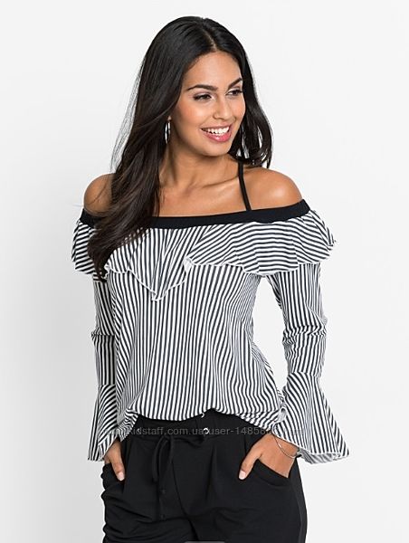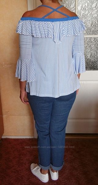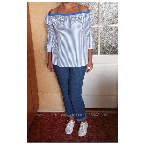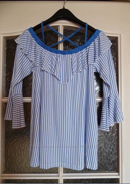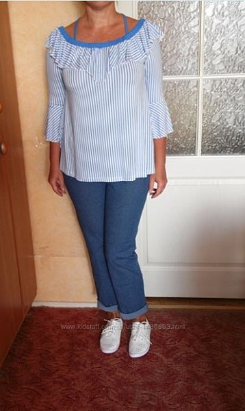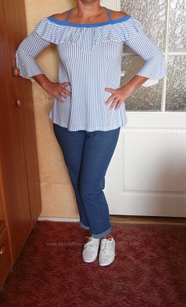 Новая блуза с модными воланами из приятного прохладного материала.Можно носить как с открытыми плечами так и с прикрытыми, горловина хорошо фиксируется на фигуре за счёт резинки.