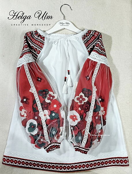 Натуральна тканина, ткане вишиття, ніжне бавовняне мереживо та кутасики ручної роботи з намистинами.