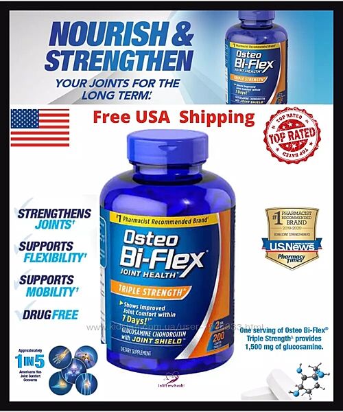Osteo Bi-Flex Triple Strength Glucosamine Chondroitin MSM виробник Johnson Health США, 200 каплетів.Комплекс був створений, щоб поліпшити відновлення суглобів після травм, сприяти мобільності, захисту і рухливості суглобів. Осте Bi-Flex є джерелом глюкозаміну, хондроїтину, MCM, 5-LOXIN, кальцію та інших важливих поживних речовин, необхідних для суглобів.