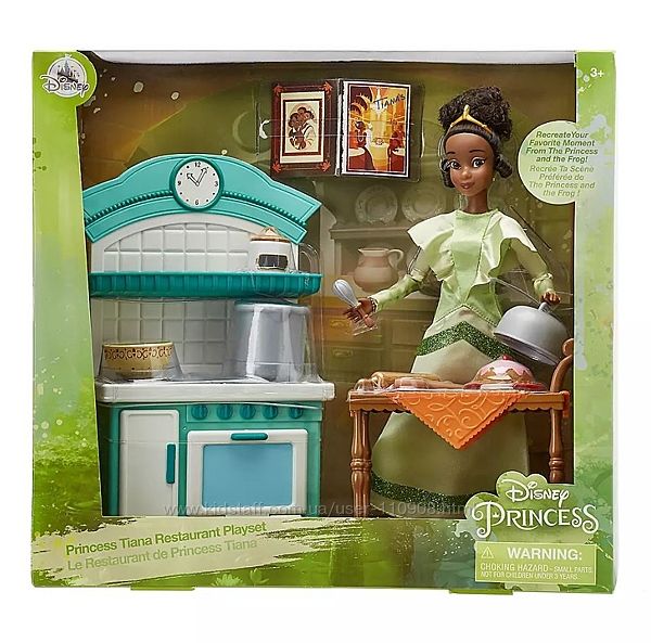 Принцесса Тиана с кухней из м/ф Принцесса-Лягушка.В набор входит кукла Тиана, сервировочный столик, кухня, посуда.Дверца духовки открывается.