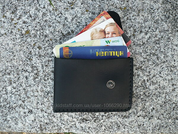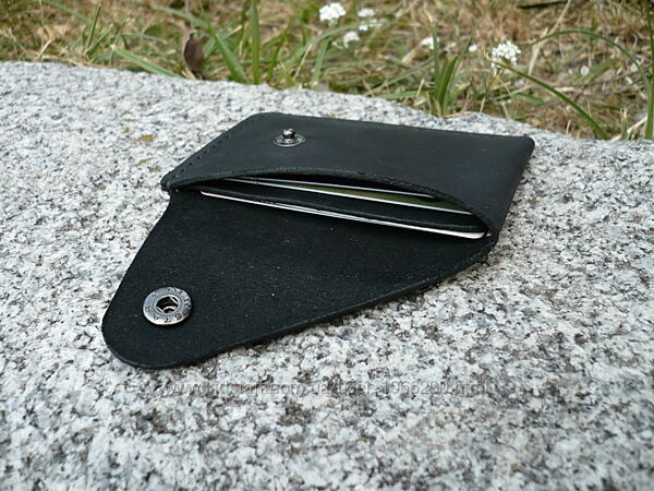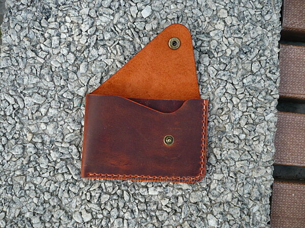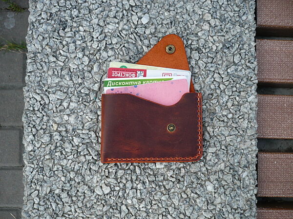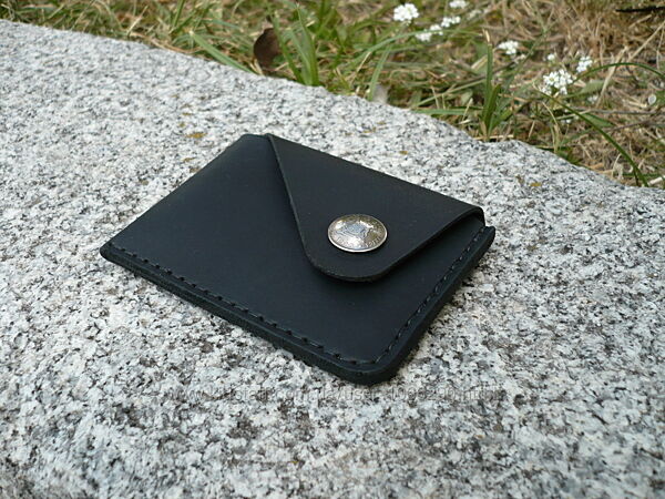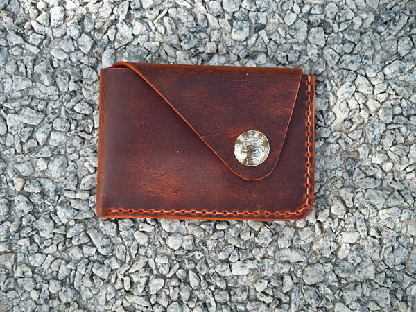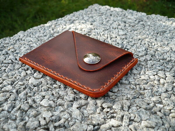 Картхолдер для ID документов, банковских или пластиковых карт. Кожа ВРХ «crazy horse». Финишное покрытие – крем iexi wrens dubbin. Картхолдер прошит вощеной нитью 0,35 мм. Размер: 75*105 мм. Кнопка украшена кончо из монеты . Ручная работа. Ценность: 380 грн.