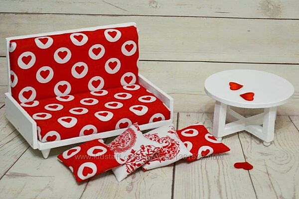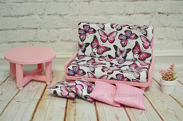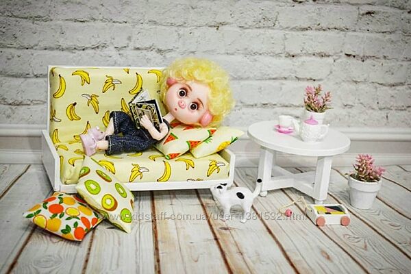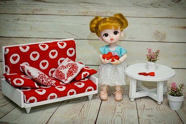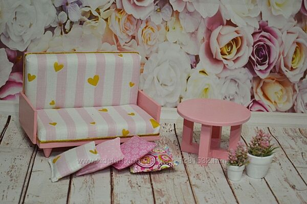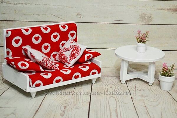 Маленький набір лялькових меблів - диван з подушками та круглий столик Підійде для найменших ляльок до 15см Ручна робота Матеріал - дерево, фарби та лак на водній основі, текстиль(бавовна) Колір за бажанням.