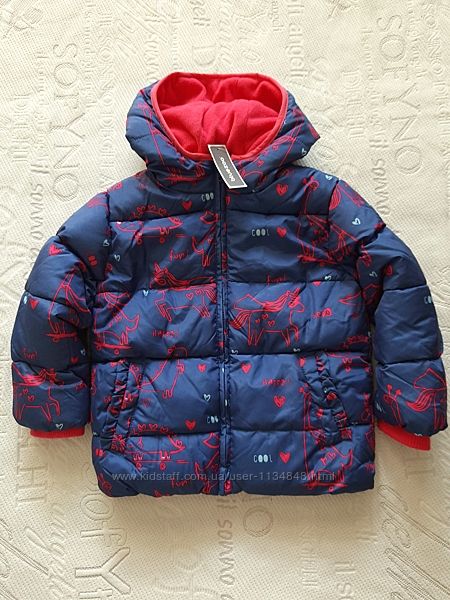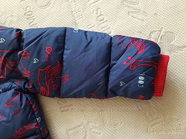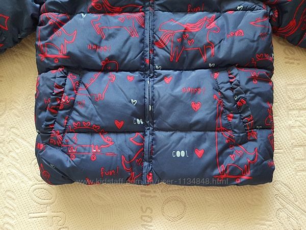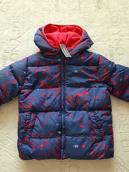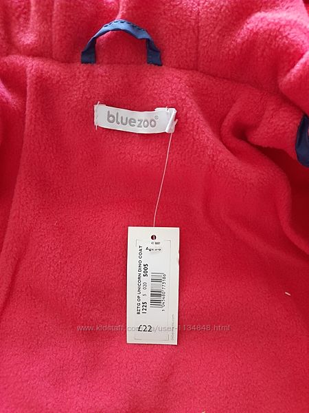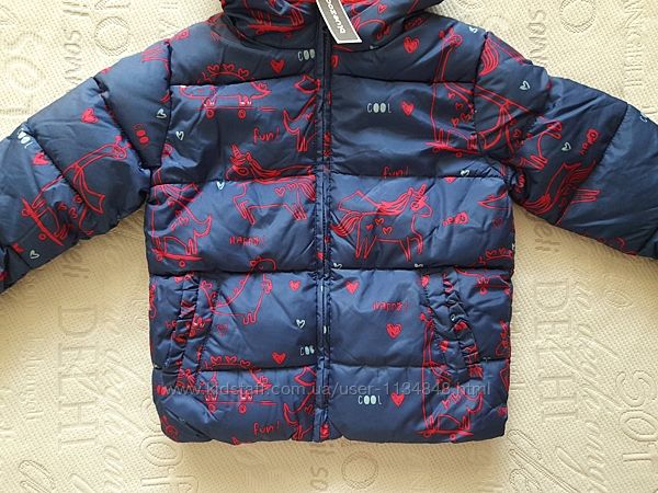 куртка Bluezoo на 4-6 лет. По бирке размер 5-6 лет ( 110-116 см).Сезон: демисезон--еврозима. Утеплена слоем синтепона. Подкладка флис. На рукавах есть манжет. Капюшон не отстегивается.Цвет темно-синий. Украшена рисунком единорог+динозаврики.
