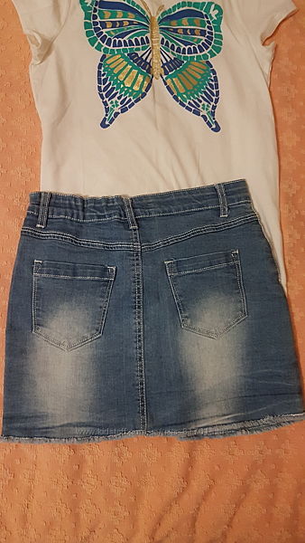 Стрейчевая джинсовая мини юбка с утяжкойРост на бирке 146-152 см ( маломерит слегка)Состав: 65% котон, 33% полиестер, 2% лайкра