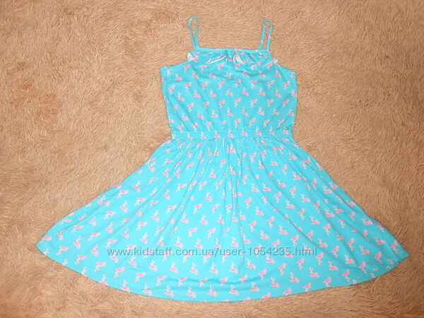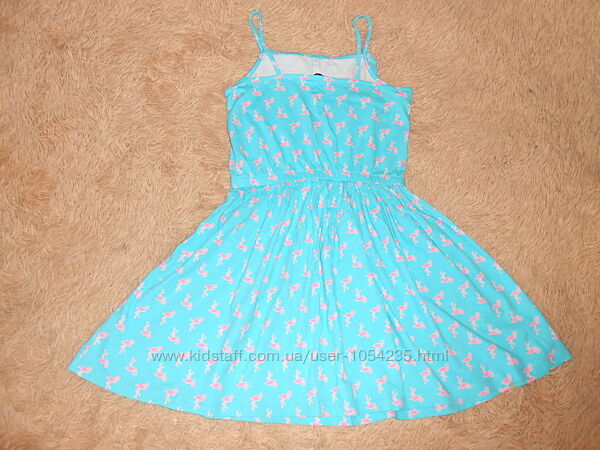 2. Сарафанчик бирюзовый с фламинго на рост 152 см., на возраст 11-12 лет "George": ширина под проймочками - 38,5 см., ширина пояса - 32 см., длина от плечика - 78,5 см. Поясок на широкой резиночке, вверху оборочка. Материал: 100% хлопок. Цена: 80 грн.