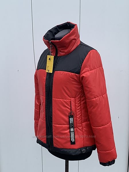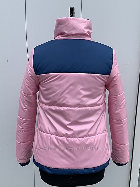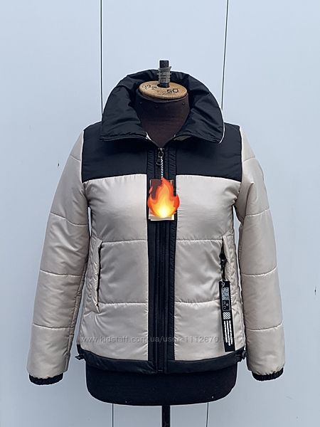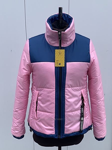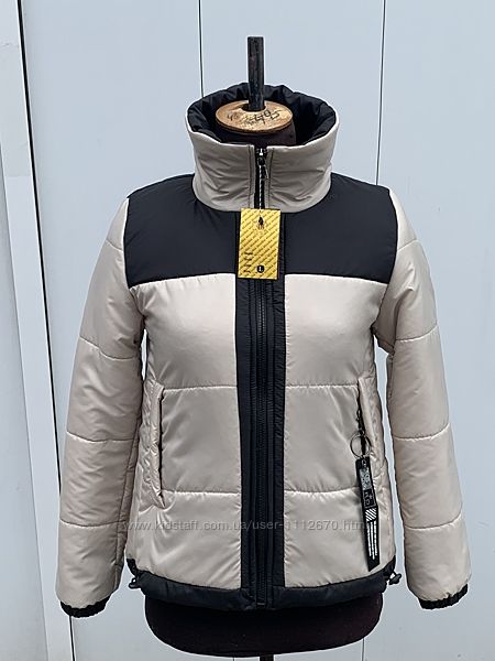 Верх куртки -плащевка. Утеплитель силикон. Плотность силикона 100. Куртка двухцветная. Цвета - белый, бежевый, красный, розовый, темная мята, электрик. Отделка на розовом – морская волна, на всех остальных цветах отделка черного цвета.