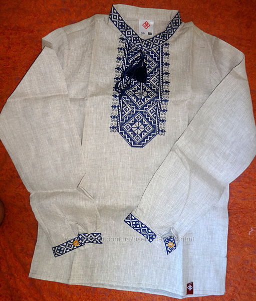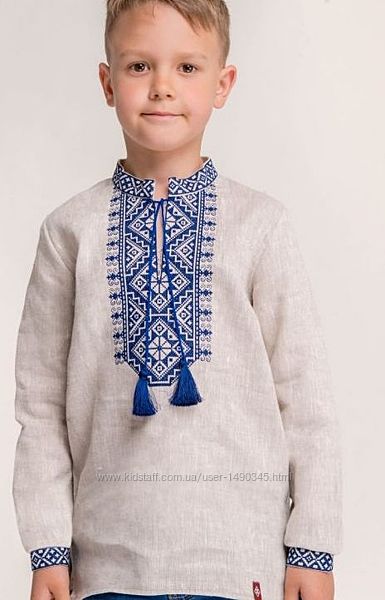 Дитяча вишиванка виконана синіми нитками, які чудово контрастують із сірою лляною тканиною, із зображенам зірки Алатир - найдавнішого символа сонця має багатий та святковий вигляд. Синій колір символізує благородство, ніжність і вірність, безкінечність моря та небес. Така вишиванка стане справжнім оберегом для кожного парубка. Комірець-стійка та манжет оздоблені машинною вишивкою. Виріз горловини доповнює шнурівка з великими китицями, а манжет має застібку, що забезпечує зручну посадку на зап´ясті.У наявності є ще багато інших сорочок на льоні з вишивкою білого, голубого, сріблястого кольру.