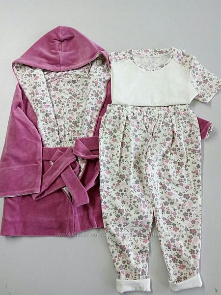 Хлопкові піжамки з велюровим халатом . Якість , перевірена роками та численними відгуками. Набір : футболочка, штани , халат . Розміри98, 104,110,116,122,128,134,140,152 Гарний варіант , як на подарунок так і собі .