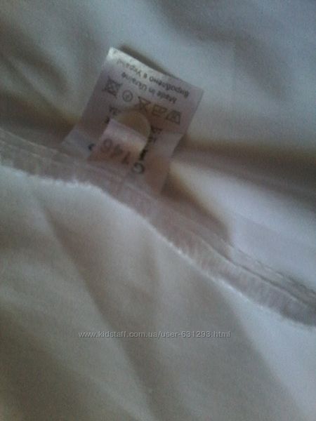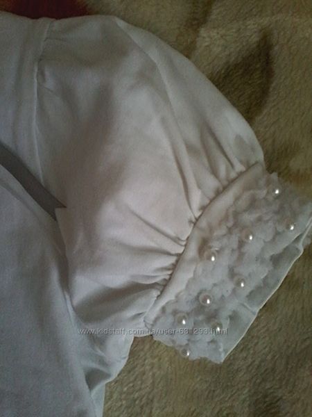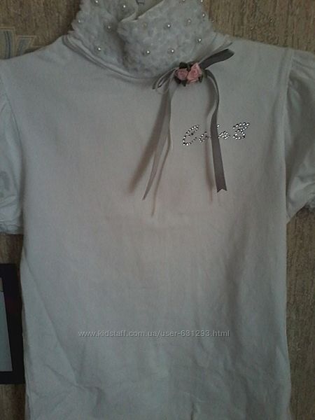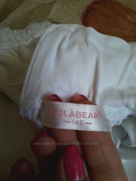 Фото 7 - 10. Наша блузка Colabear, р. 146, воротник стоечка, украшен оборочками и бусинами, брошь съемная, стразы в надписи все на месте, рукав фонарик, сзади застегивается на замок, маломерит. Состояние отличное, носили мало. Не растянута, пятен нет. 250 грн.