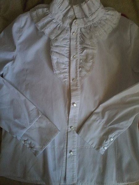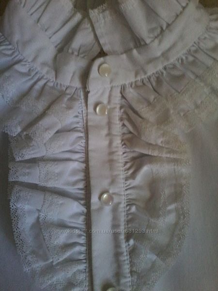 Фото 1 - 6. Наша школьная блузка с длинным рукавом Gold Kids р. 146. Украшена рюшами с кружевом, пуговицы как жемчужинки. Смотрится нарядно как с юбкой так с брюками и шортами. Состояние идеальное. Состав 100% хлопок. 370 грн. Замеры: