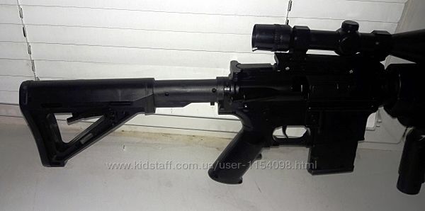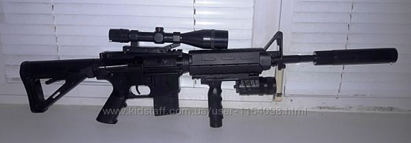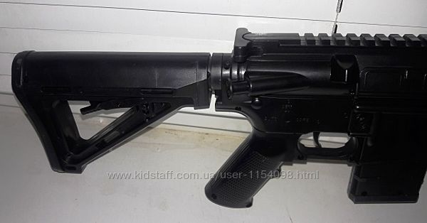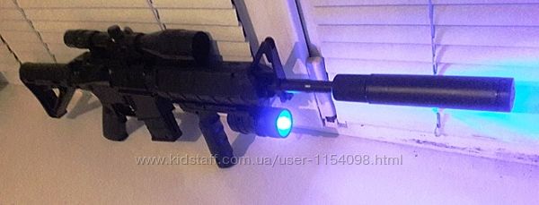 Автомат выполнен невероятно тщательно и на первый взгляд ее практически невозможно отличить от настоящего оружия. Она оснащена оптическим, лазерным прицелом, а также фонариком и отлично подходит для обучения меткой стрельбе по мишеням. Ни в коем случае не цельтесь в человека или животных и не наводите лазерный прицел в лицо, ведь лазер может представлять опасность для зрения.
