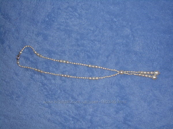 Набор украшений - жемчуг: ожерелье, серьги и браслет.Длина ожерелья - полная - 29 см, без висюлек - 21 см. Диаметр браслета - 7 см. Диаметр бусин в серьгах - 1 см.