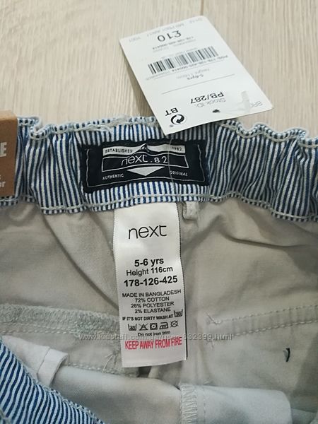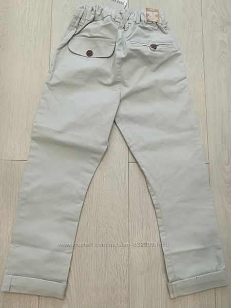 Новые светло-серые чиносы Next, размер 116, большемерят на 122. Хлопок.Длина 68.5 (73 см если развернуть штанину), Шаговый шов 46 (51 в развернутом состоянии. Пот 28.5см.