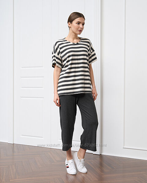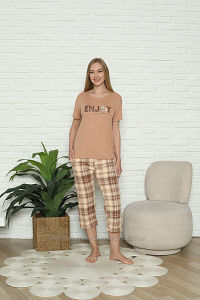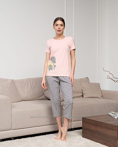Комплект футболка и капри пошиты из мягкого нежного материала, в них будет комфортно спать или отдыхать.Такое белье не вызывает раздражений, даря незабываемое ощущение комфорта.