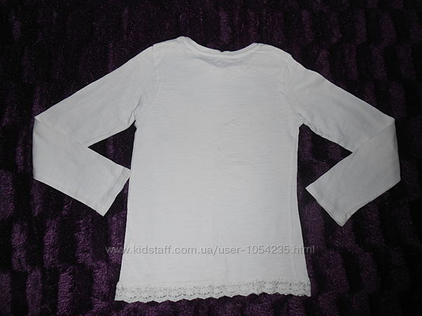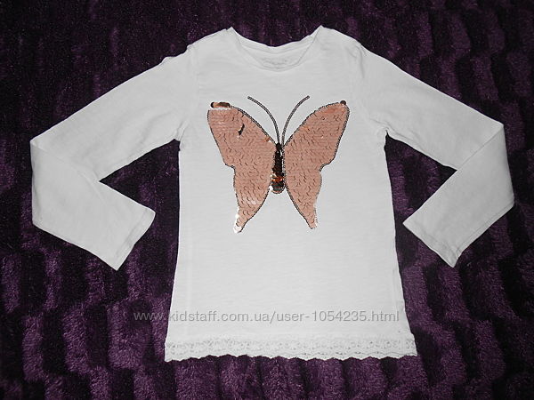 2. Регланчик белый с бабочкой на рост 128 см., на возраст 7-8 лет "Primark": длина рукава - 45,5 см., плечико - 6,5 см., ширина под рукавчиками - 31 см., длина от плечика - 45,5 см. Горловинка на широкой резиночке, внизу ажурная оборочка, впереди блестящая аппликация из пайеточек. Материал: 100% хлопок. Цена: 45 грн.