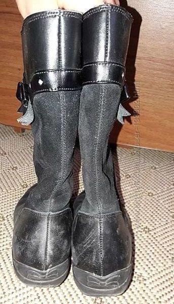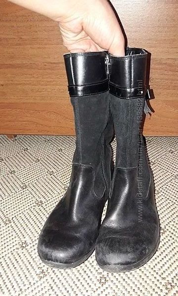 Верх-натуральная кожа и натуральная замша. Внутри текстиль.Высота -25см., ширина по голени - 14см. На ножке смотрятся аккуратно!