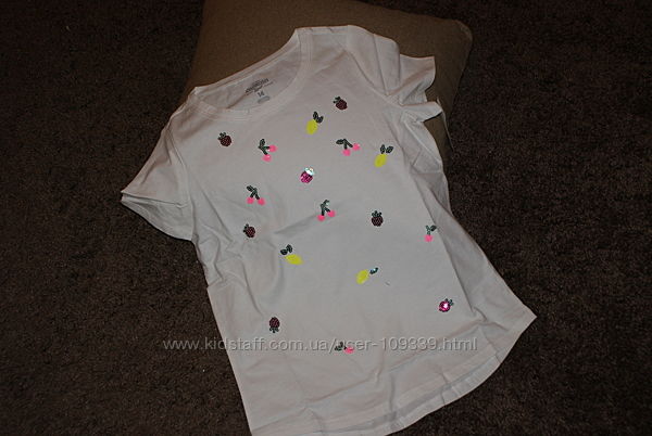 Белая футболка , carters украшенная яркими фруктами из пайеток, очень красиво переливаются на солнце или на свету, не знаю передаст ли фото.