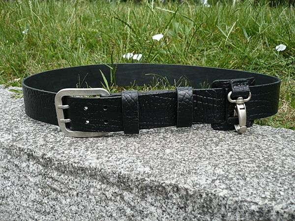 Ремінь із підвісом для ключів. Шкіра рослинного дублення з фактурним тисненням «слон» на лицьовій поверхні (виробництво Італія), колір чорний. Виворіт шліфований, виріз оброблений воском. Довжина 1210 мм (без урахування пряжки), ширина 50 мм, товщина 3 мм. Пряжка і карабін з покриттям під срібло. Пряжка закріплена вощеною ниткою galaces 0,55 мм, запряжник фіксується ремінними гвинтами. Ручна робота. Цінність: 900 грн.