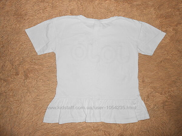 2. Футболочка белая с бантом на рост 116-122 см., на возраст 6-7 лет "George": плечико - 11 см., ширина под рукавчиками - 35 см., длина от плечика - 44 см. Горловинка на резиночке, внизу оборочка, впереди разноцветная блестящая аппликация с бантиком из пайеточек. Материал: 100% хлопок. Цена: 45 грн.