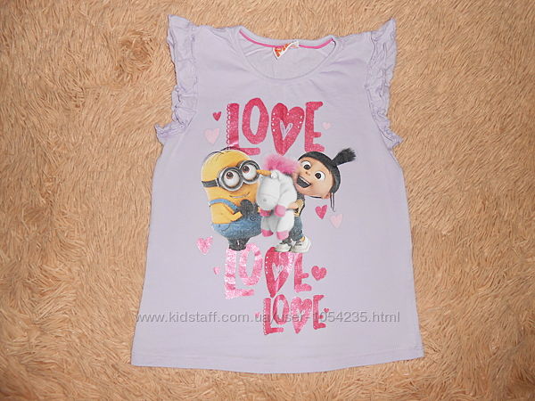 Продам футболочки для девочки на рост 122 см., на возраст 6-7 лет.1. Футболочка сиреневая с миньйонами на рост 122 см., на возраст 6-7 лет: плечико - 7 см., ширина под рукавчиками - 33,5 см., длина от плечика - 46 см. Горловинка на резиночке, на плечиках оборочки, впереди разноцветная блестящая аппликация. Цена: 45 грн.