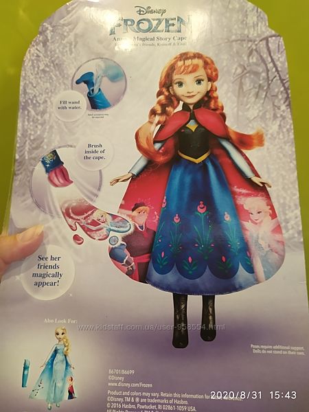 В комплекте: кукла, платье, пара сапожек, кисточка. Размер игрушки: 28 см. Disney Frozen Anna´s Magical Story Cape Doll Возрат не предусмотрен