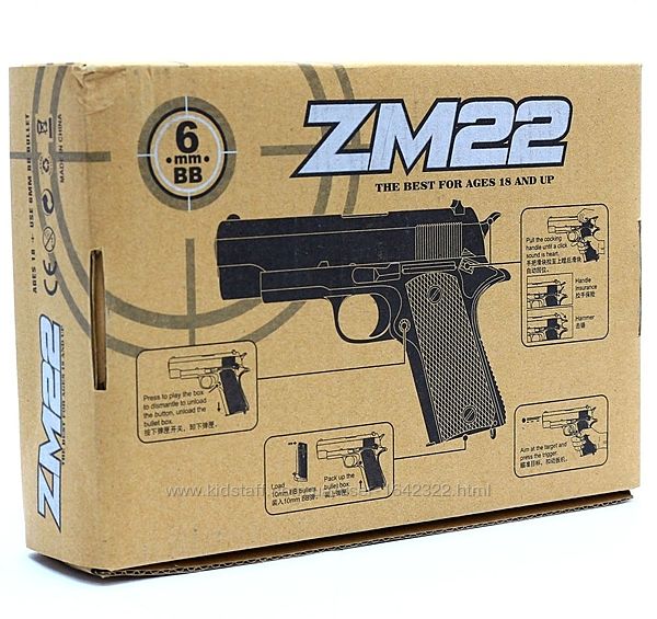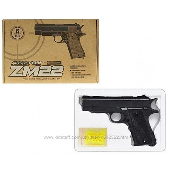 Детский пистолет ZM22 металлПистолет заряжается пластиковыми пульками калибром 6 мм, которые помещаются в обойму и способны пробить картонную коробку насквозь! Оружие выглядит очень внушительно, имеет практически 100% сходство с настоящим пистолетом, корпус выполнен из металла с пластиковыми накладками, обойма, при нажатии на небольшую кнопку на корпусе пистолета, легко выпадает, внутри обоймы находится пружина, которая способствует подаче пулек. Перезаряжается пистолет с помощью отвода затвора и выстрел происходит при резком нажатии на курок.