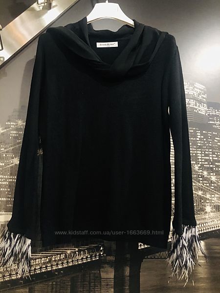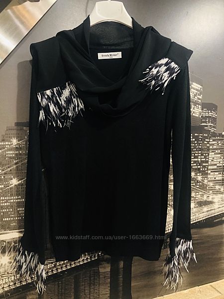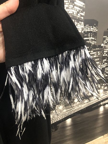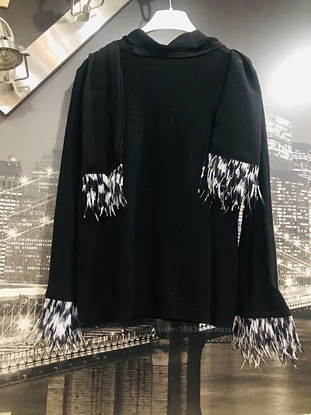 Фото 1-5 Красивая єффектная кофта чёрного цвета с V вырезом и шарфом,рукава и шарф снизу украшен натуральными чёрно-белыми перьями,шарф можно носить в разных вариантах,очень мягкая и приятная к телу,тянется,размер S/M.