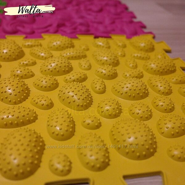 Килимок складається з 1 модуля. Зроблений з екологічно чистого, гіпоалергенного матеріалу, що ефективно амортизує ударне навантаження. Масажні елементи різної форми оптимальні для тренування мязів стопи.