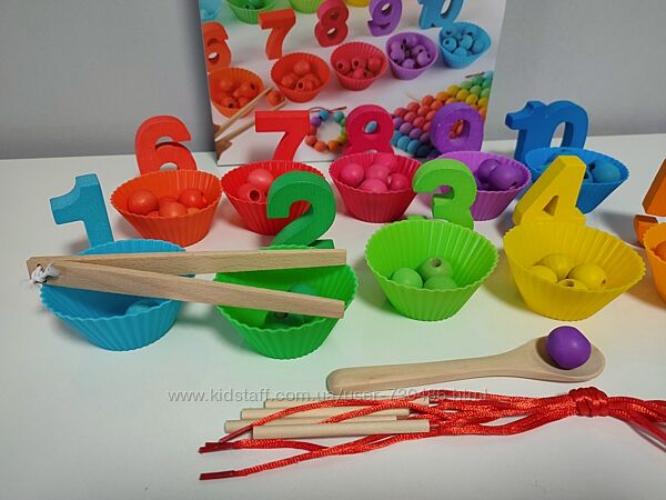 Сортер «Счёт и цвета» — развивающий набор для детей, развивает мелкую моторику, внимание, память и мышление. С его помощу ребёнок выучит цифры и цвета, научится считать. Количество шариков соответствует цифре и цвету. Следите, чтобы малыш складывал в тарелочки необходимое количество шариков и не путал их цвета. Сортировать можно просто пальчиками, ложечкой или щипцами. Также в наборе есть шнурочки с деревянной иголкой для удобного нанизывания бусин.Комплектация: 10 цифр, ложка, щипцы, 4 шнурочка, 10 тарелочек, 55 цветных шариков, мешочек.
