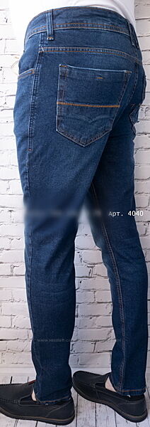 Комфортные мужские классические джинсы нормальных размеров. Синего цвета. Плотный, не шлифованый джинс. Пятикарманка средней посадки. Прямой крой брючин, узкие. Удобная посадка в талии. Застегиваются на молнию. Качественная фурнитура. Высветлены вдоль штанины. Спереди: полукруглые глубокие карманы, справа карман для монет оригинальной формы. Широкие штрифки для пояса. Обшит нитками контрастного цвета. Под карманами выварка-жатка. На краях карманов и внизу штанин эффект поношености (порезы).Сзади: большие накладные карманы со строчкой. Вытерты под карманами. Создают привлекательную фигуру.