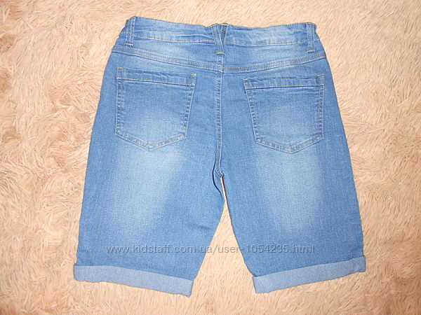 2. Джинсовые бриджики на рост 164 см., на возраст 14 лет "Miss E-Vie": ширина пояса на максимуме - 34,5 см., ширина бедер - 39 см., длина - 43 см. Поясок регулируется внутри по ширине пуговичками, застегивается на пуговичку и змейку, впереди и сзади по два кармашка, внизу бриджики с подворотиками. Материал: 80% хлопок 19% полиэстер 1% эластен. Цена: 60 грн.
