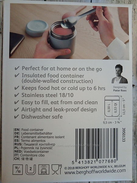 Пищевые термосы очень удобны – их можно брать с собой в дорогу, в офис, на тренировки, во время велопрогулок и пр., так как они предоставляют возможность поесть домашнюю пищу в любое время. Термос бельгийского бренда Berghoff изготовлен из пищевой нержавеющей стали 18\10 с двойной стенкой, прочной, с отличными антикоррозийными свойствами.