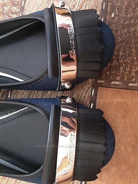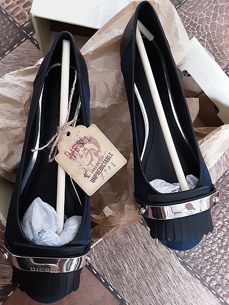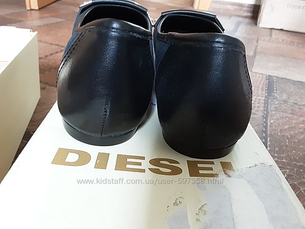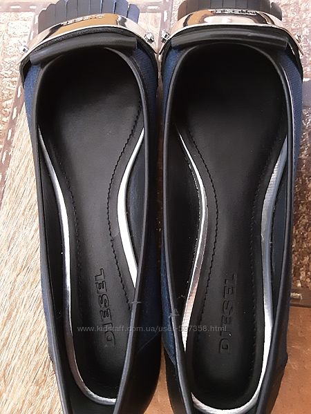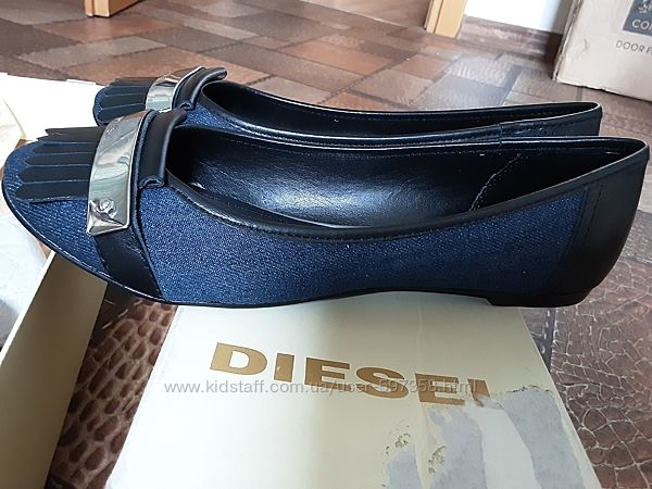 Идеальные стильные балетки Diesel, оригинал.Верх- текстиль джинсовый стиль, отделка металлической пряжкой и бахромой из искусственной кожи, пятка кожаная.