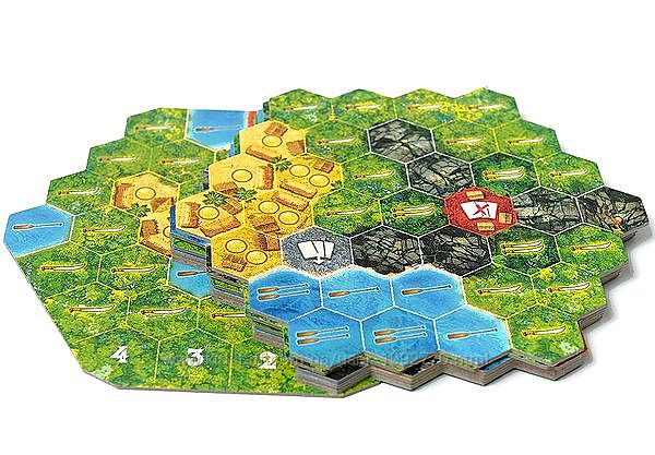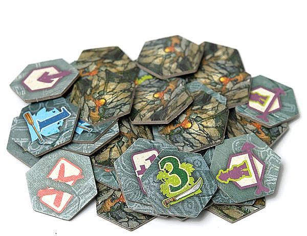 В коробке: 7 фрагментов маршрута, 2 отрезка маршрута, конечный момент маршрута, 6 препятствий, 8 фишек игроков, 4 планшета экспедиций, шляпа первого игрока, планшет рынка, 80 карт экспедиции, 36 жетонов пещер, правила игры.