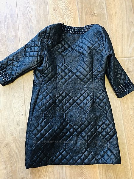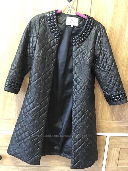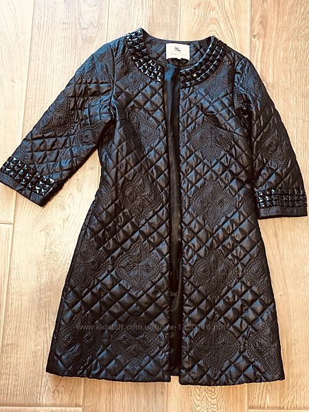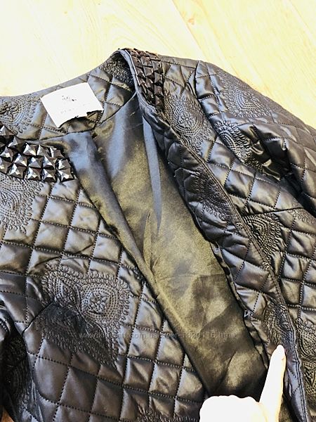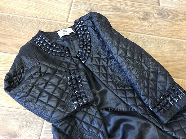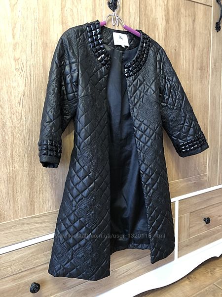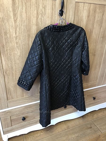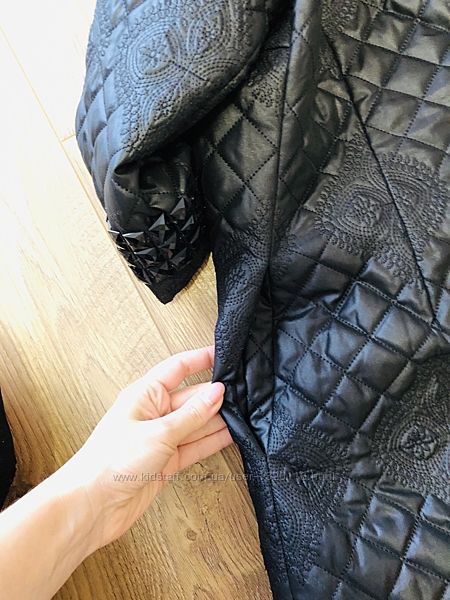 Плащик в ідеальному стані, одягнутий два рази. Дуже стильний і практичний. Рукав 3/4 обшитий знизу камінцями. На грудях потайні застібки, як на мене краще носити розстібнутий. Є кишені. Трішки утеплений в середині синтапоном. Якість супер. Тканина зовні не блистить, світло з телефону так відбиває. Без нюансів, як новий.Рукав від плеча 43