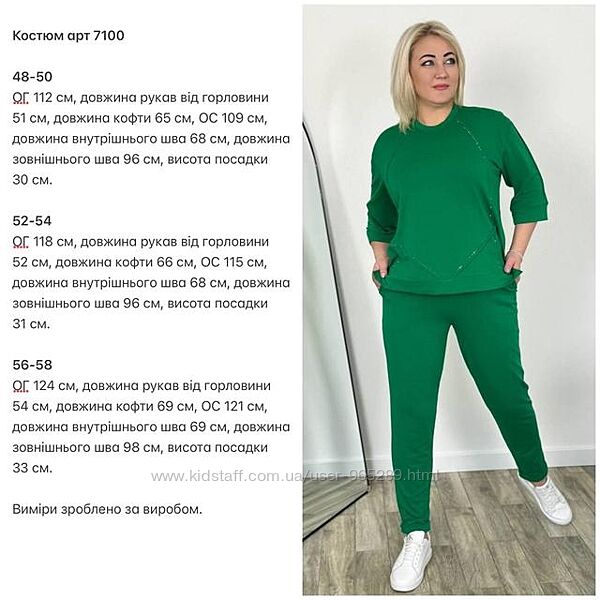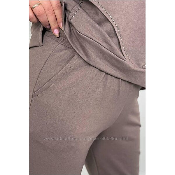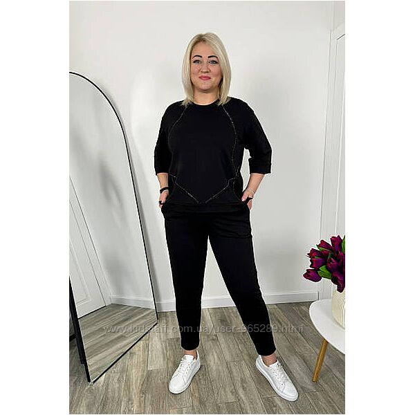 Костюм кофта + штани. Кофта оброблена термостразами, рукав 3-4, з боків розрізи. Штани талія на гумці, з кишенями, внизу підгин.