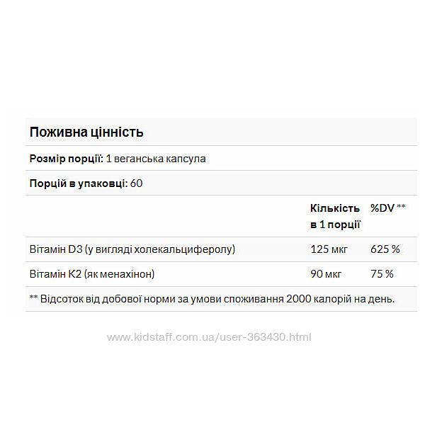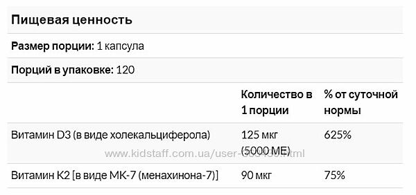 Склад: Вітамін D3 (у вигляді холекальциферолу) 25 мкг (1000 МО) + вітамін K2 (у вигляді менахінон-4) (MK-4) 45 мкг 38 %