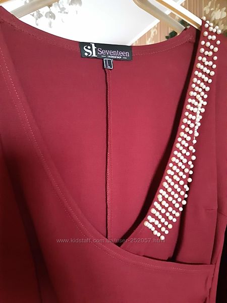 Платье, сделанное из мягкой и приятной на ощупь стрейчевой ткани, привлекает внимание своим марсаловым цветом и необыкновенным оформлением. Добавить нотку страсти и соблазнительности в образ поможет открытое декольте на груди, вместе с приталенным фасоном подчеркивающее все достоинства фигуры. На рукавах и одной части декольте жемчужная россыпь, которая придает образу роскоши, блеска и восхитительности.